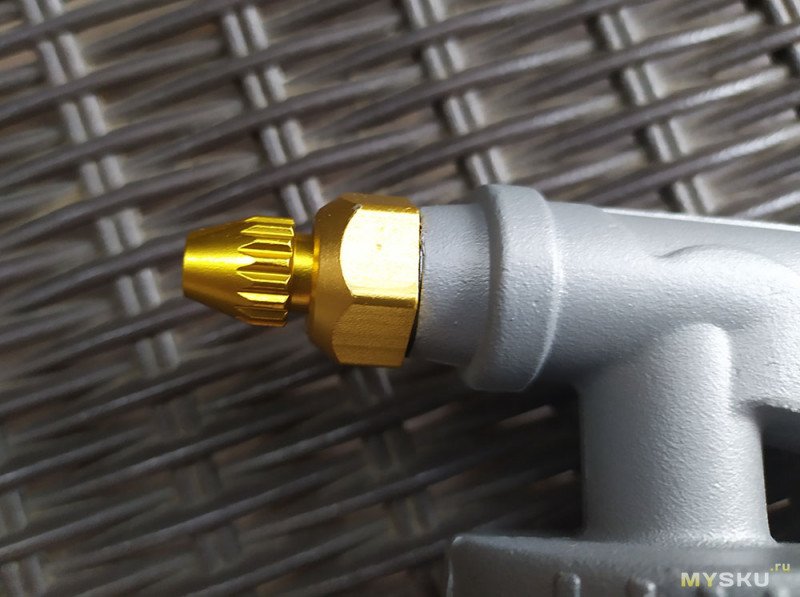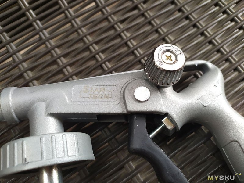 Как и обещали, на пистолете имеется рабочая плавная регулировка подачи воздуха: от полного перекрывания до полного открытия примерно 2/3 хода регулировки.