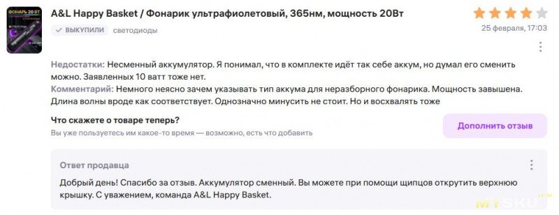У меня уже есть достаточно мощный УФ-фонарик, купленный 5 лет назад за $18. Этот купил чисто из любопытства из-за низкой цены. Ну и убить/потерять не жалко, а то знакомые мой так и норовят заигать.