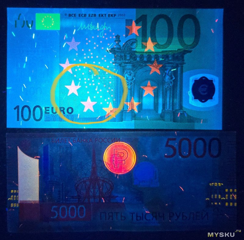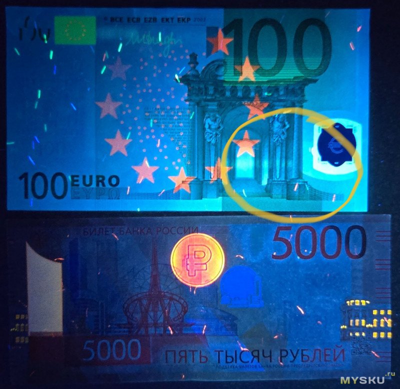 Самое главное — не обманули ли про 365 нм. Для проверки сделал две фотографии — старым и новым. Деньги ярко светятся только в 365 нм, так что всё честно. Которая из фотографий каким сделана, специально не скажу, гадайте сами — пусть будет слепое сравнение. Ну и в его свете ярко сияют все «прелести» на стенах в ванной. Жена сказала, что лучше б она этого не видела.