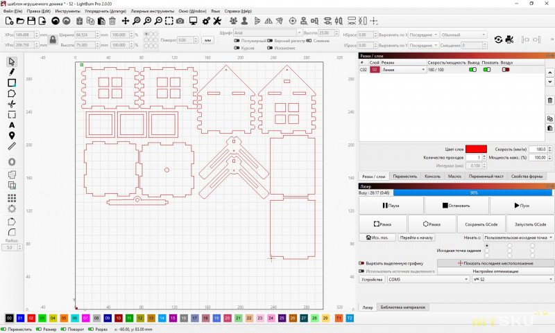 В проекте lightburbn может быть несколько слоев, например один слой это линии, по которым нужно резать, второй слой это картинка, которую нужно гравировать. И для этих слоев можно задать разные мощности. Я выбрал проект Шаблон игрушечного домика, он создан для фанеры 3мм и его детали помещаются в рабочую область 300*300мм.