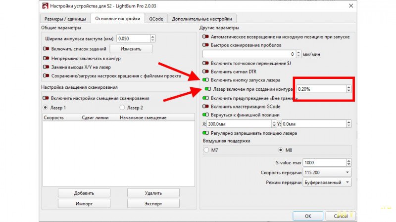 В Lightburn в настройках устройства я включил кнопку запуска лазера и включение лазера при создании контура. При этом я задал минимальную мощность, при которой работает 7 ватт лазер, это 0,2%.