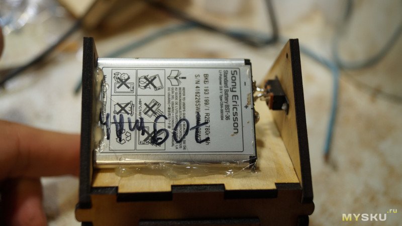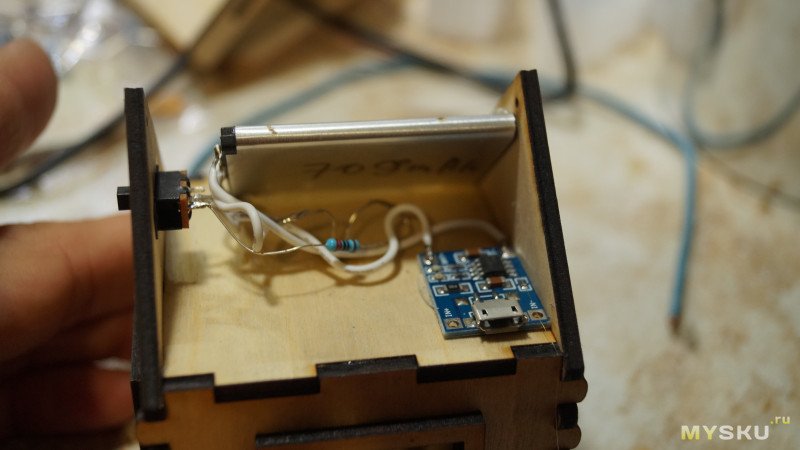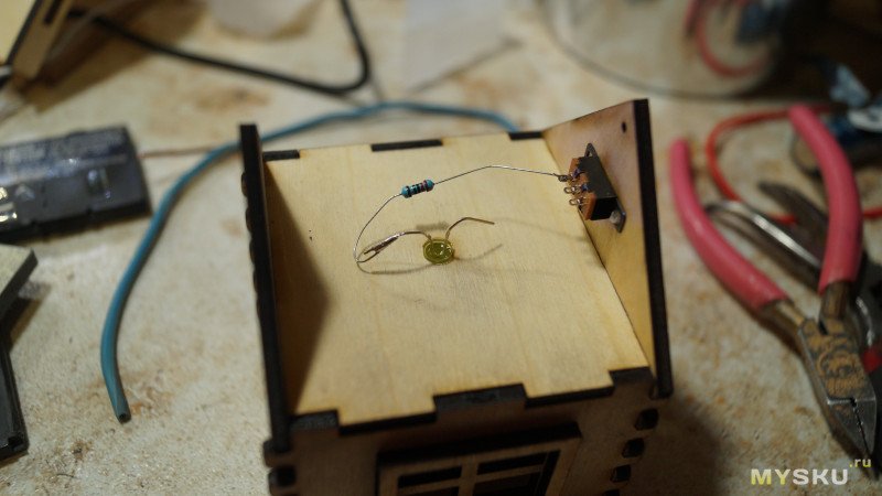 В домик можно добавить свет. В перекрытии домика как раз есть отверстие диаметром 5мм, туда входит светодиод. На этой же пластине я закрепил литиевый аккумулятор, от него резистор и выключатель светодиода, приклеил его на суперклей. Ну и приклеил плату с TP4056 для зарядки этого аккумулятора.