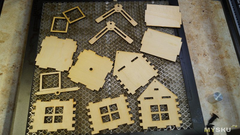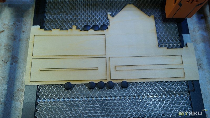 Фанера закреплена на сотовом столе, лазер позиционирован, детали вырезаются примерно 27 минут.
