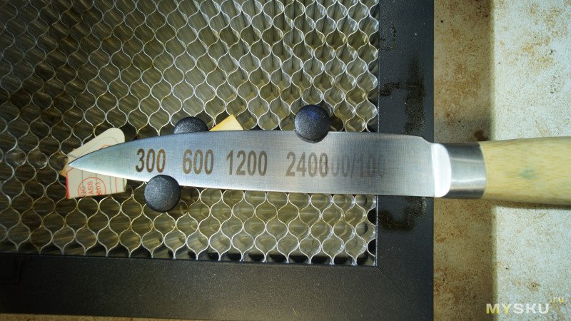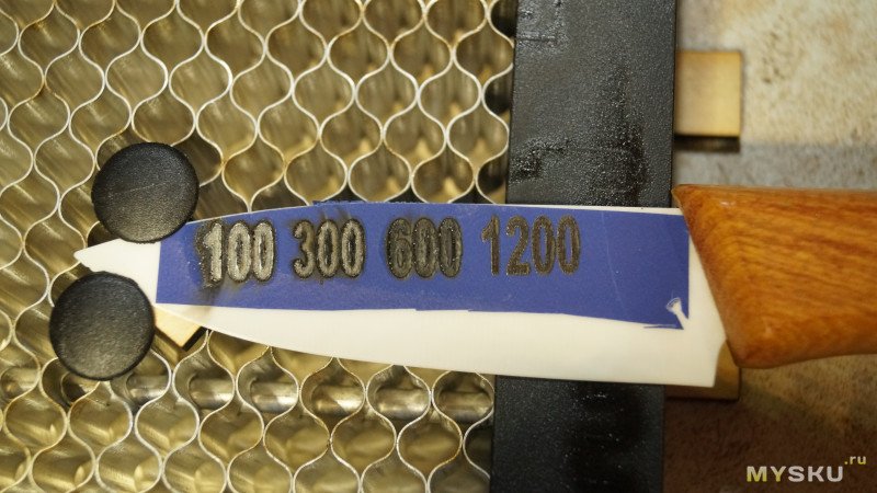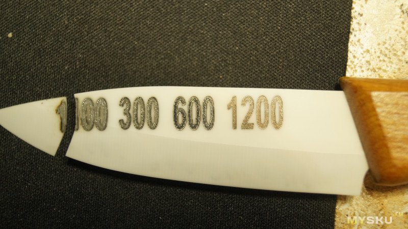 Попробовал гравировать без пленки — на лезвии остались незначительные следы, какие-то полосы, но даже не видно контур цифр. Видимо без покрытия гравировать на керамических ножах не получится.