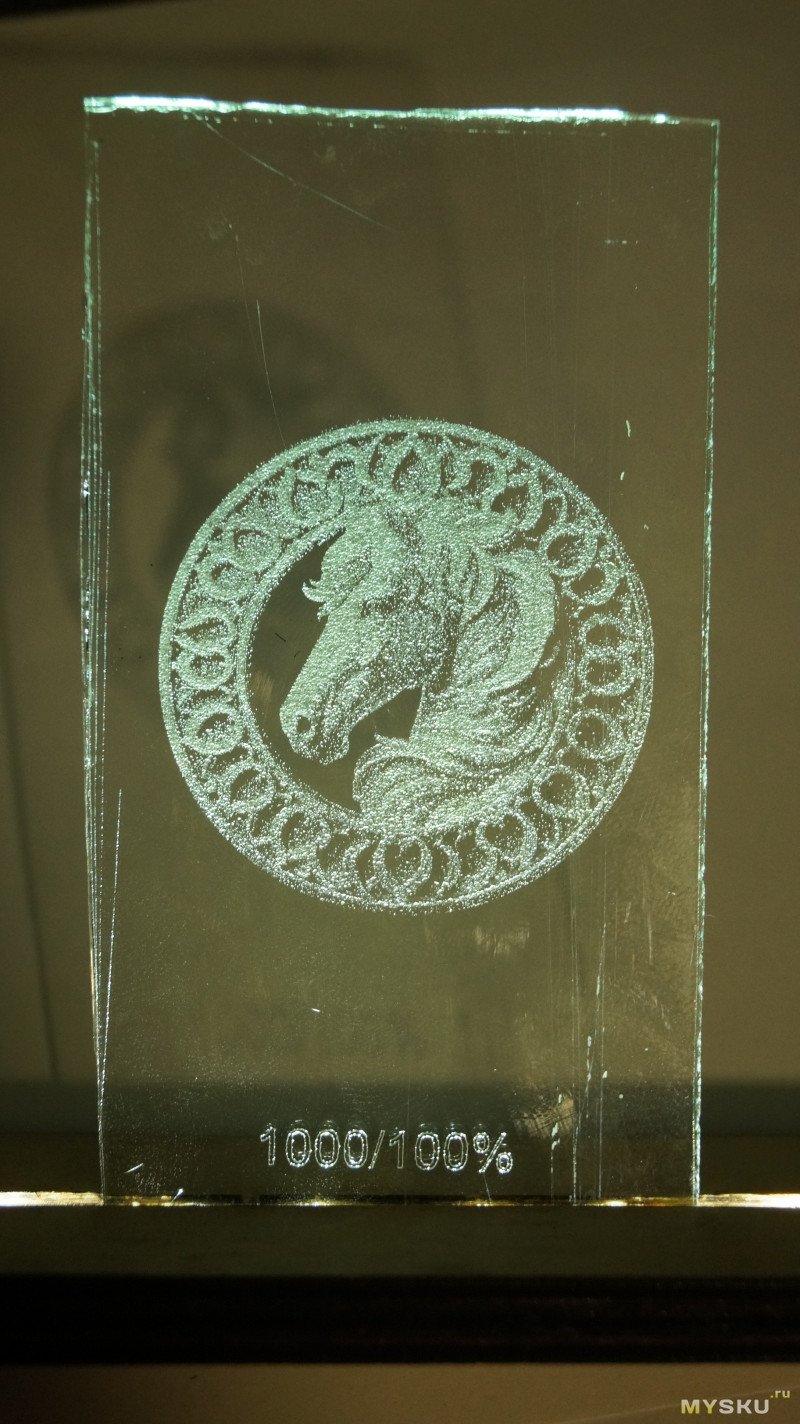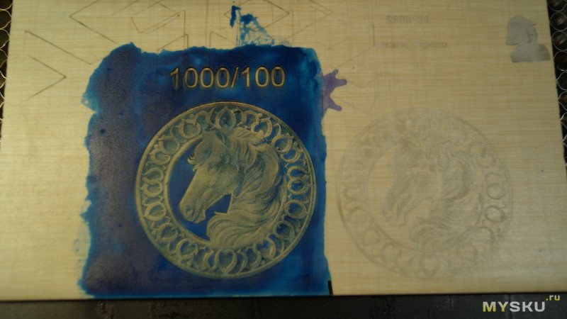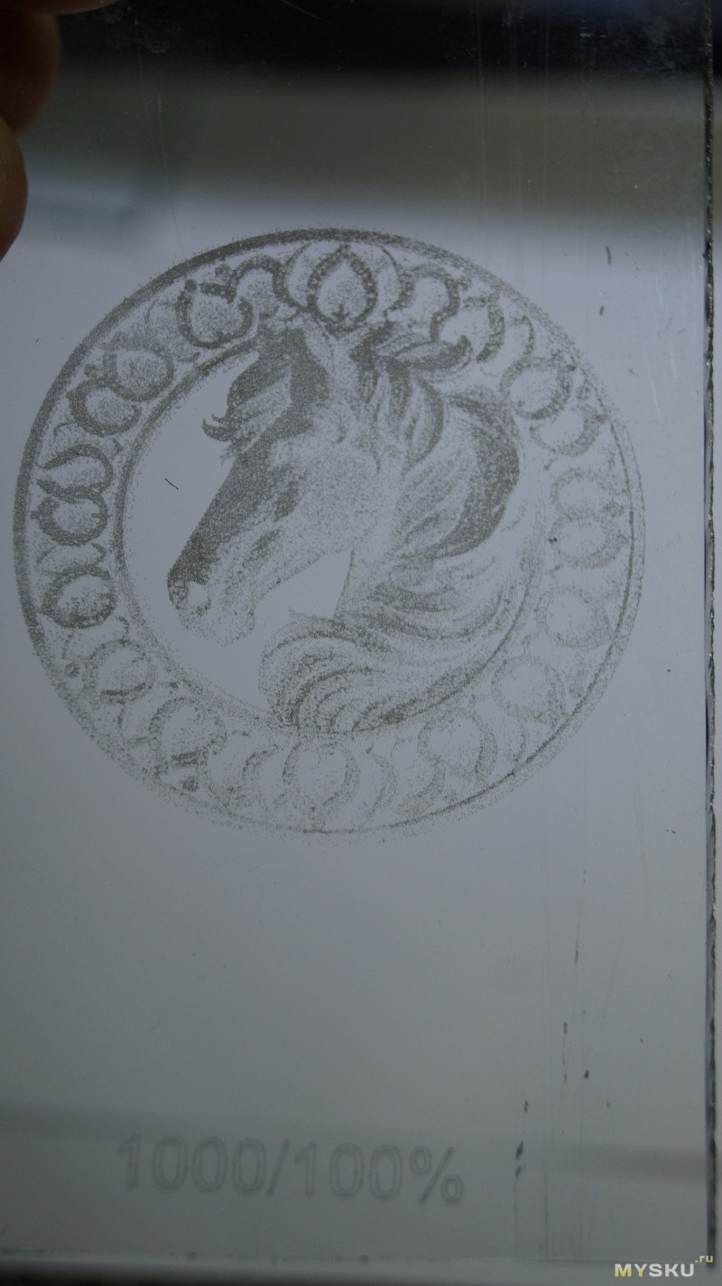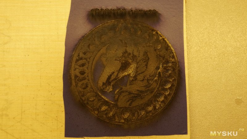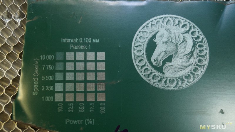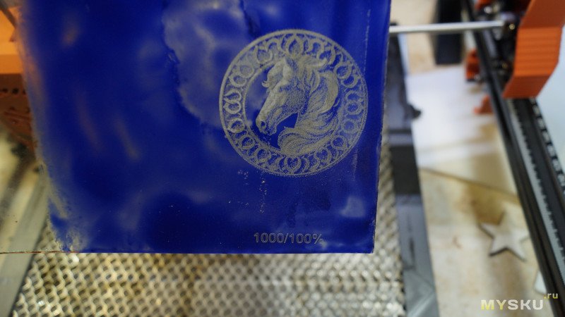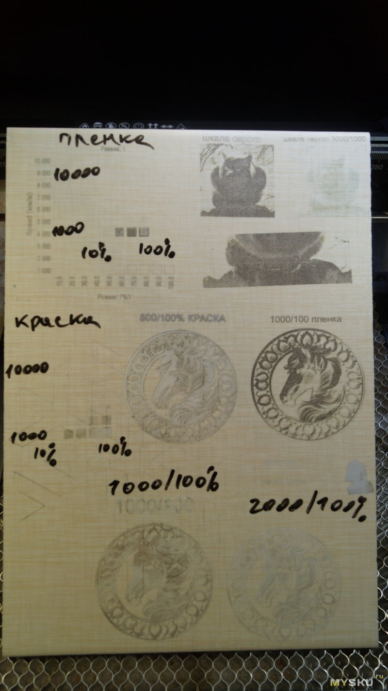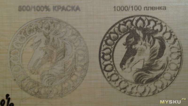 Результаты можно увидеть на фото. В левом нижнем углу части, гравированные под краской, в правой верхней части под пленкой. При одинаковых параметрах 1000мм/мин и 100% мощности картинка под пленкой в разы темнее. При скорости 1000 такая лошадь гравируется примерно полчаса. По пленке можно гравировать быстрее, но от нее сильный неприятный запах.