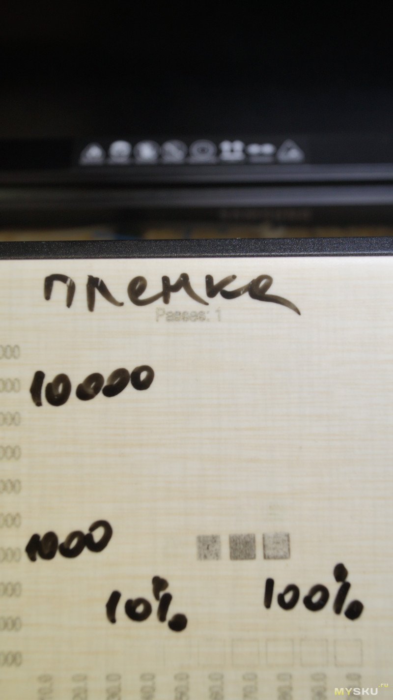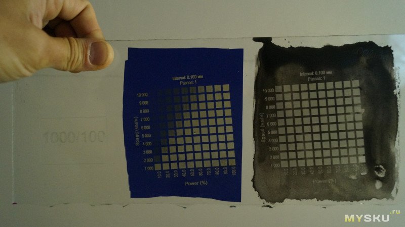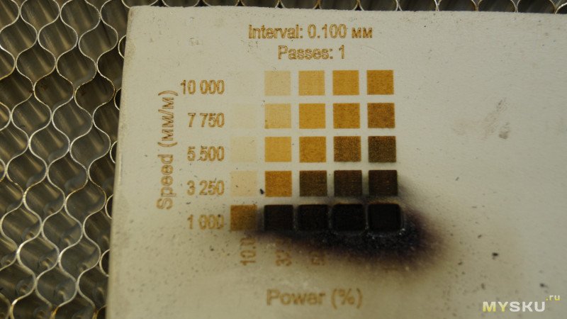 Для проверки гравировки на этом пластике запустил тестовую таблицу с мощностями от 10 до 100% и скоростями гравировки от 1 000 до 10 000мм/мин. Видно, что можно гравировать на скорости 5000-10000мм/мин и варьировать яркость мощностью.