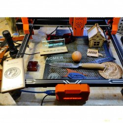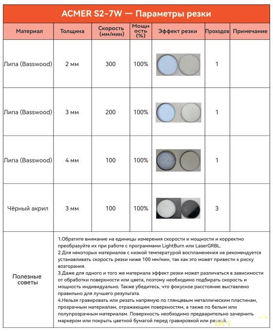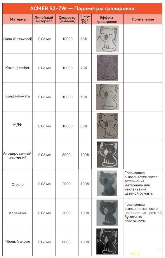 Интересный гравер. Может резать фанеру 3мм — проверено. В инструкции написано, что может резать и 4мм. Режет некоторые виды пластика и тонкую кожу. Написано, что режет акрил, но я такого не нашел. Гравирует на дереве, коже, пластике, стекле, металле, керамике, анодированном алюминии и возможно на других материалах. При этом стекло, керамику нужно чем-то покрывать. У У продавца ACMER на алике есть маркировочная бумага, возможно работать с ней удобнее. Так же к граверам серии S2 желательно докупить сотовый стол с рабочей областью как минимум 320мм — чтоб на 300мм резать и по 10мм чтоб закрепить заготовку. При этом внешний размер такого стола будет 360*360мм, в раму этого гравера войдет до 400*400мм.