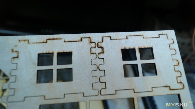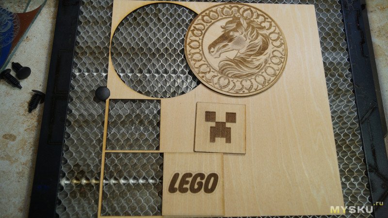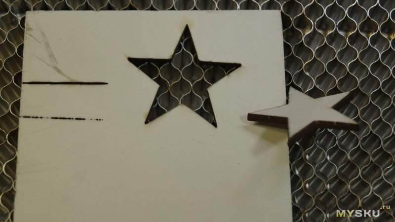 Гравирует отлично, режет не очень. То есть горизонтальные линии прорезаны, вертикальные нет. Странно.