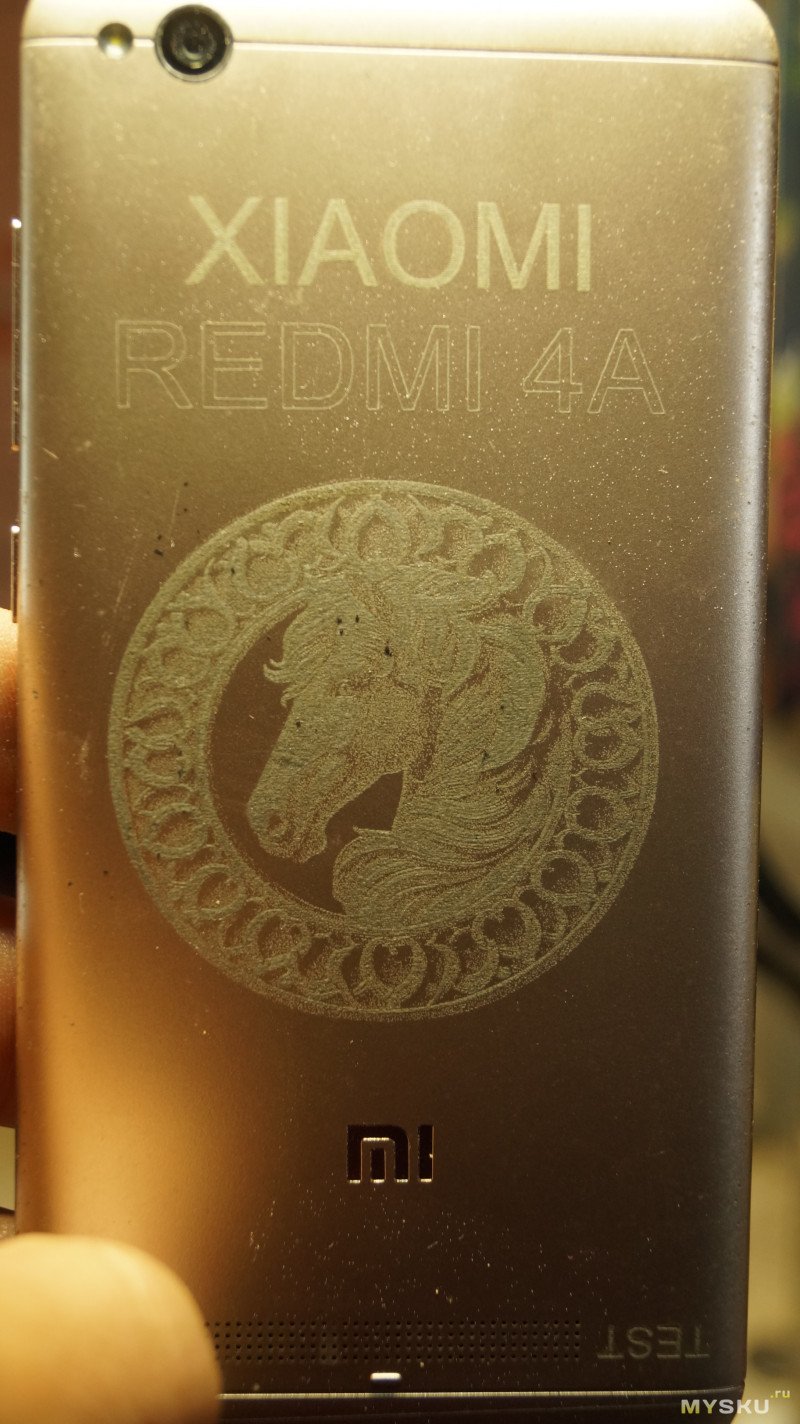 Ну и попробовал гравировать на задней крышке старого телефона — отлично гравирует на 10000мм/мин и мощности 80%