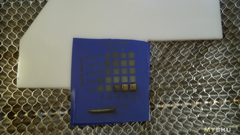 Результат гравировки цифр отличный, при этом они впитали в себя цвет краски. Результат гравировки тестовой таблицы — след виден при гравировке на скорости 1000 и мощности от 50 до 100%.