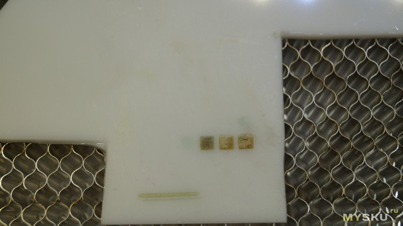 Попробовал резать и гравировать на белом оргстекле. Так-как поверхность отражающая, то заклеил стекло виниловой пленкой — не режет даже на 100мм/мин, остаются малозаметные следы.