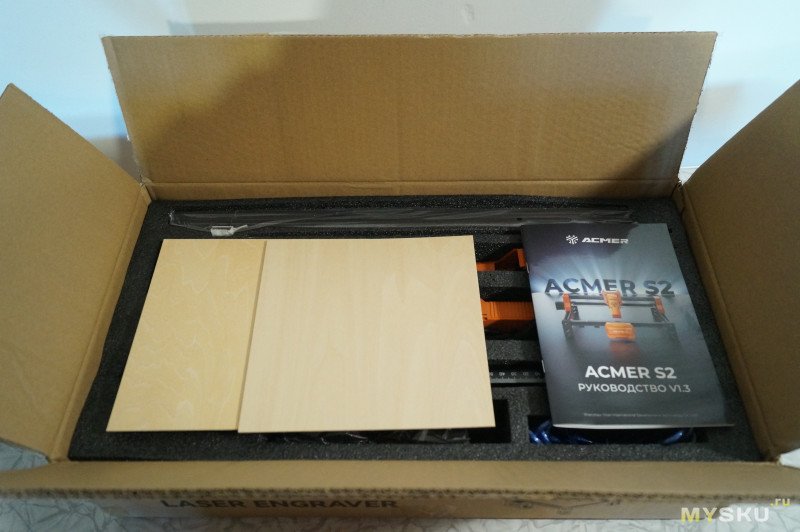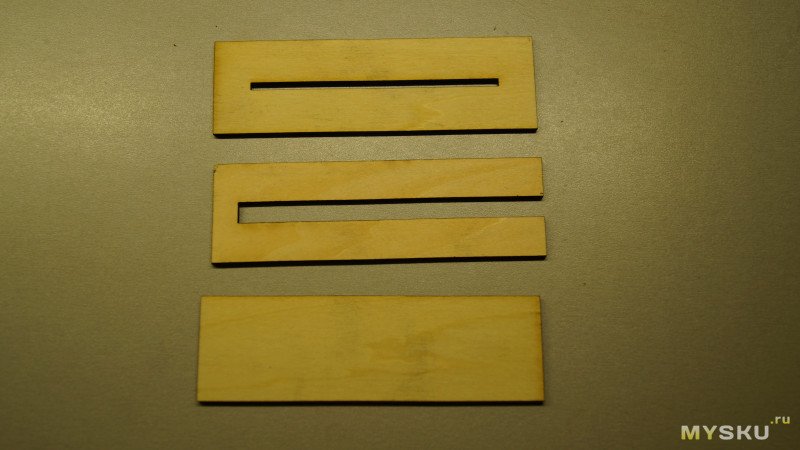 Лазер приходит в коробке в разобранном состоянии. В комплекте есть два пробника — два кусочка фанеры толщиной 2мм.