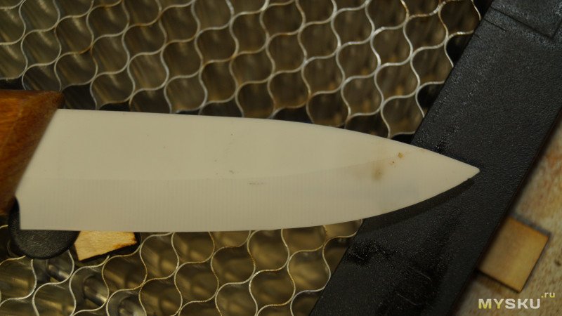 На изломе видно, что лазер глубоко прожег лезвие. То есть керамические ножи можно гравировать, но на скоростях от 1000мм/мин и выше. Или же понижать мощность.