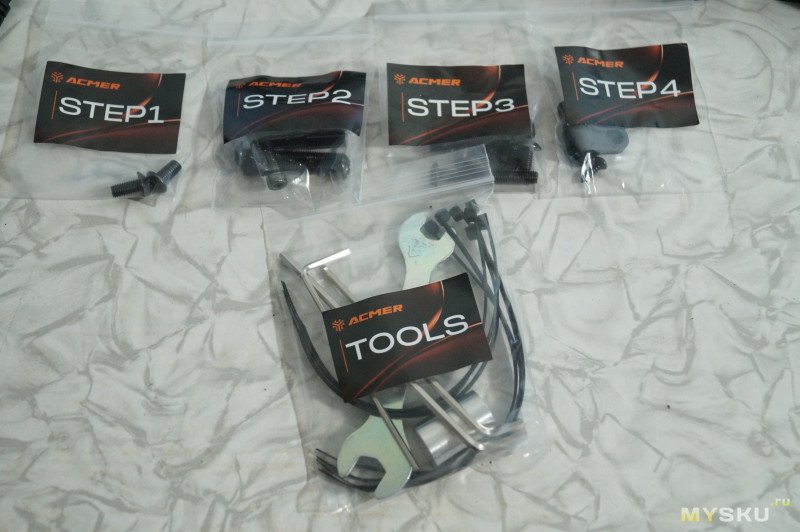 В коробке есть все необходимое для сборки. При этом все необходимые винты лежат в своих пакетиках с наклейками Step1, Step2 и так далее. В отдельном пакете лежат три шестигранника, гаечный ключ, фиксаторы провода и хомуты.