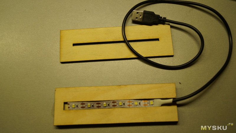 Изготавливаю из фанеры подставку для стекла. Три куска фанеры и кусочек светодиодной ленты с питанием от USB. Просто склеил их столярным клеем.