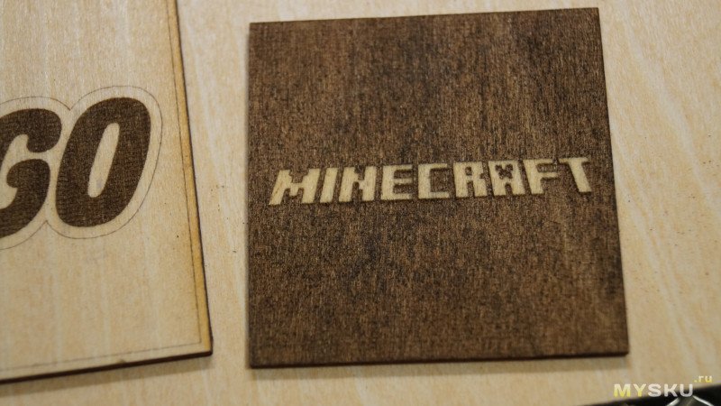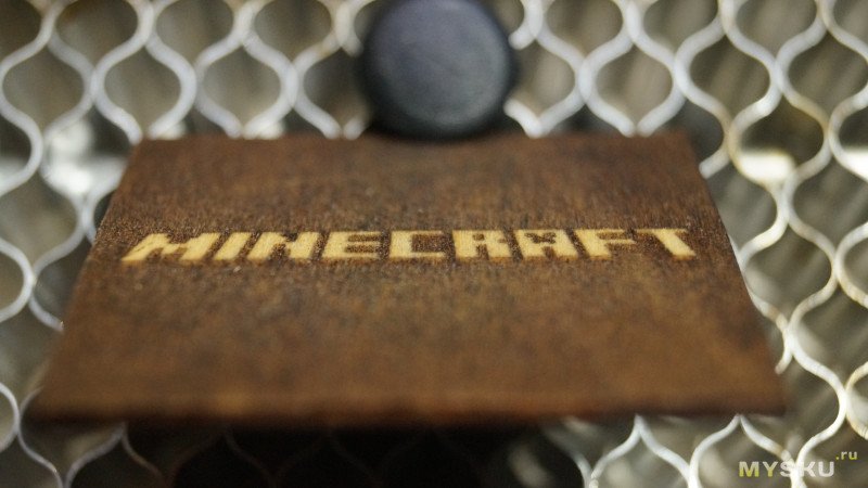 На обратной стороне значка загрузки майнкрафт я выжег надпись minecraft. При этом выжег ее инверсно и поставил параметр «Гравировка перекрестными штрихами». При этом лазер выжигал поле вокруг букв дважды — проходил горизонтальными и вертикальными штрихами.