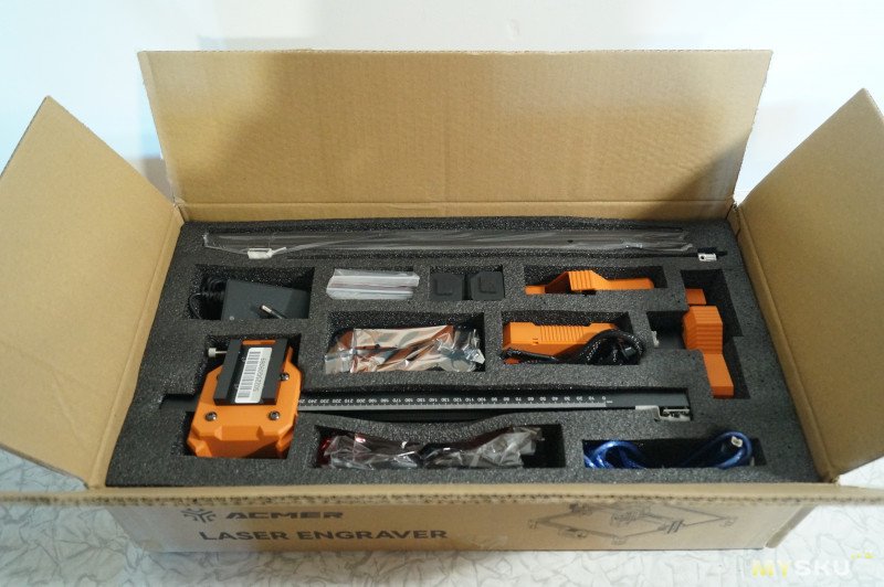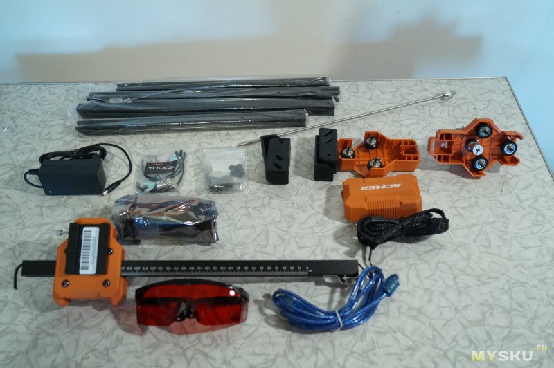В комплекте направляющие гравера, лазерная голова, блок управления с подключенными проводами, кабель USB, блок питания на 24 вольта. Есть красные защитные очки.