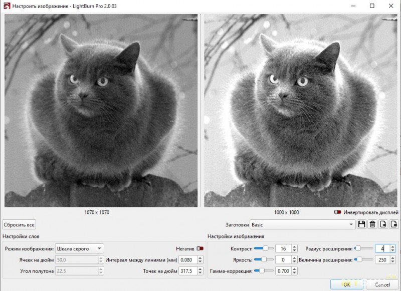 В Lightburn есть встроенный редактор для корректировки, подстройки рисунка под материал.