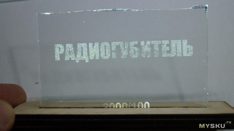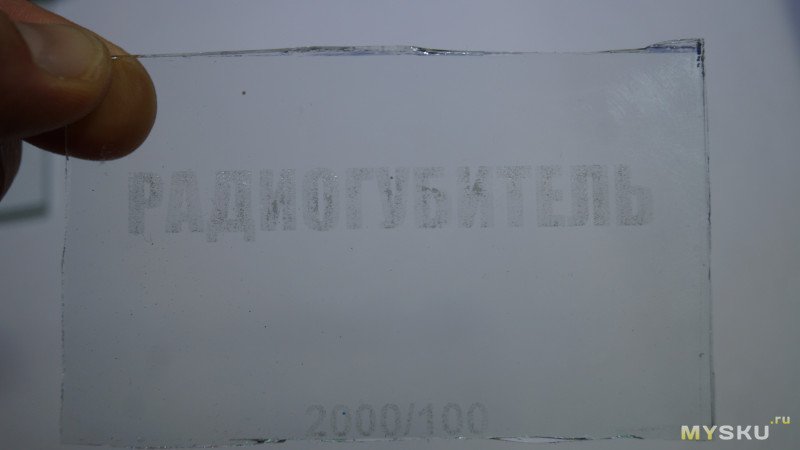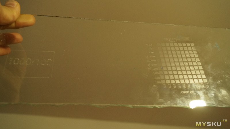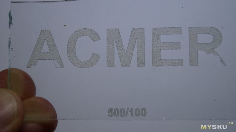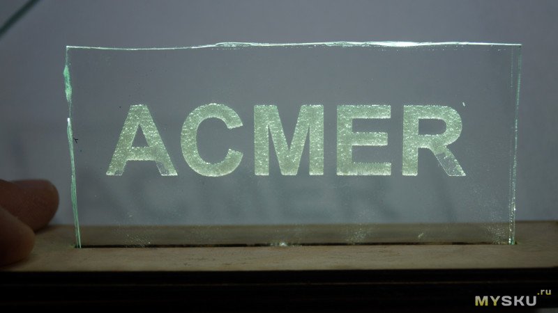 Гравировал на стекле надпись ACMER на скорости 500мм/мин. Буквы видны хорошо, но в некоторых местах матовые куски стекла отпали и под ними прозрачное стекло. Похоже мощность слишком большая.