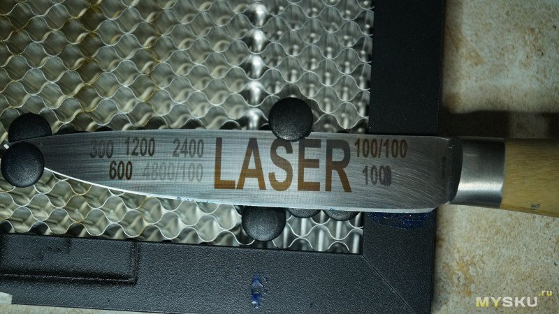 Закрепил нож, сфокусировал лазер, попробовал нанести надпись «LASER» — все отлично.