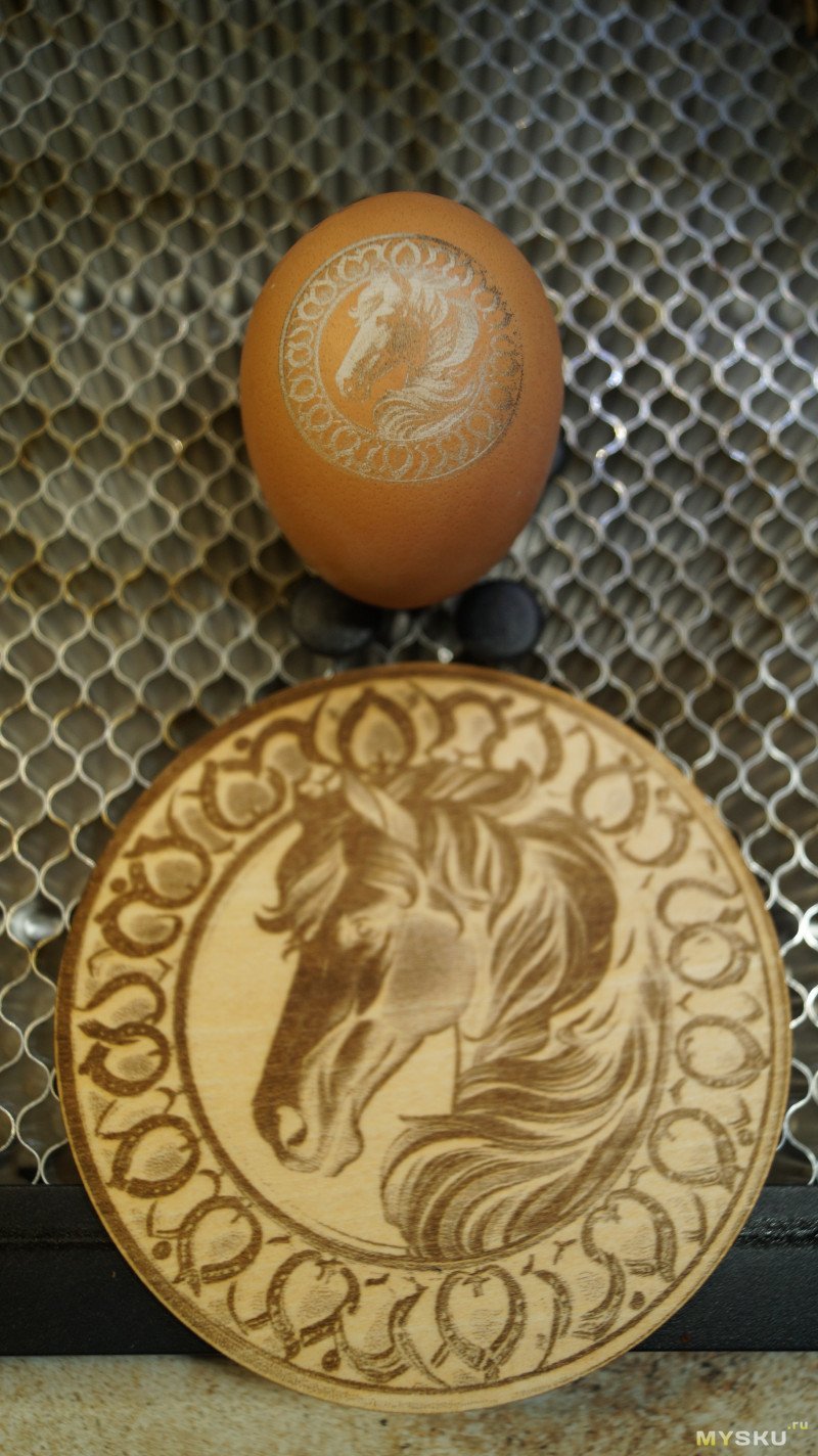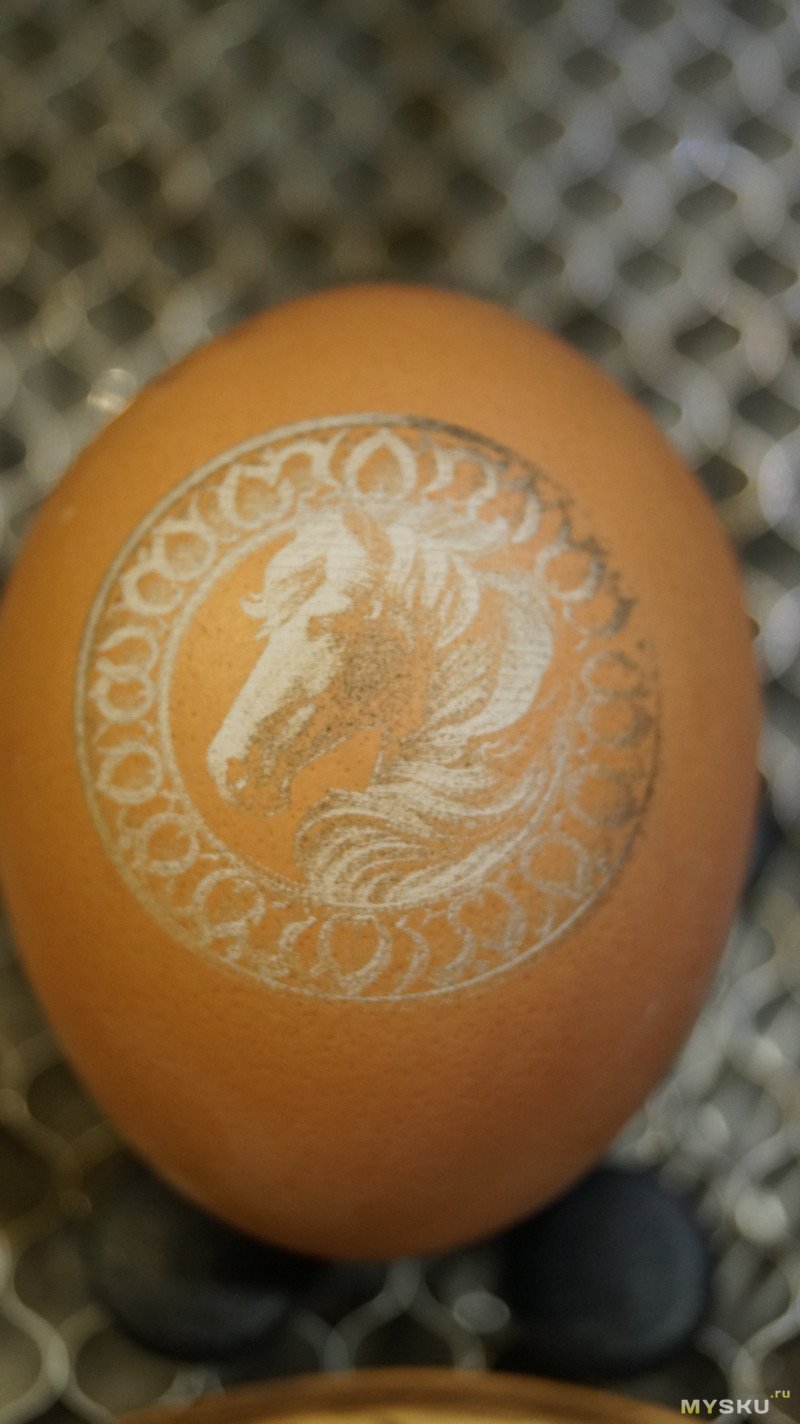 Получится ли гравировать по яйцам? Для этого я взял коричневое яйцо и отправил на него эту же картинку лошади, выставив ее размер 3см.