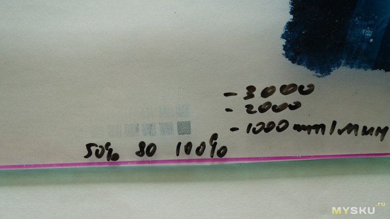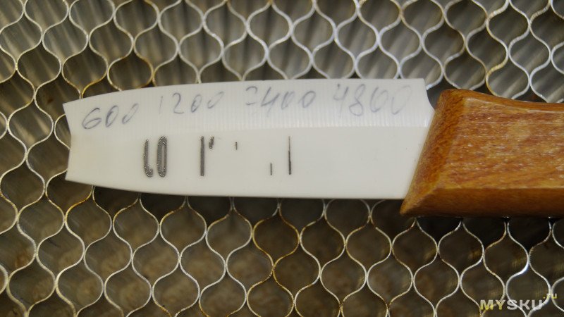 Потом решил попробовать гравировку на разных скоростях, от 300 до 4800мм/мин. Все надписи видны, но почему-то надпись 300 выглядит светлее, чем надпись 600 и даже 1200.