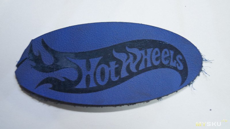 Другой кусок кожи, толщина 1,2мм. Гравирую на нем лого HotWheels и обрезка овалом вокруг.