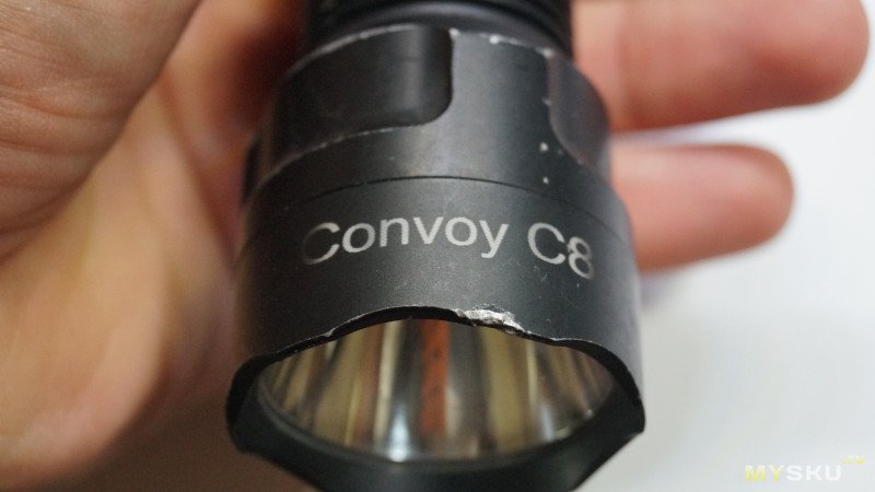 Но может не обязательно точно фокусировать лазер на поверхности? Я попробовал гравировать на анодированном металле фонаря, при этом сфокусироровал лазер на 2мм ниже верхней точки головы фонаря. Создал надпись «Convoy C8» в редакторе. Получается, что фокус примерно в районе букв «о» и «y», остальные буквы до или после фокуса.