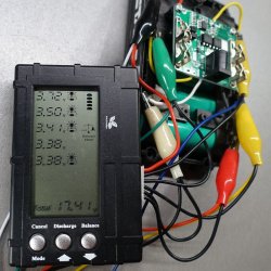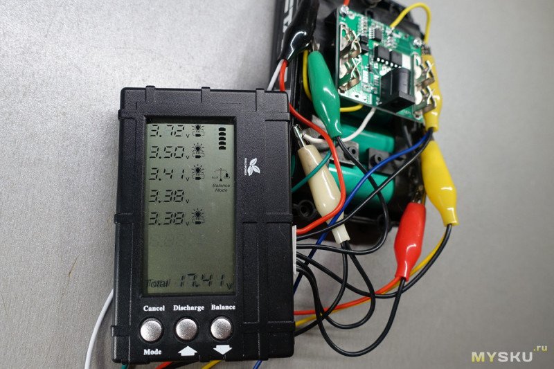 Кнопка Balance запускает процесс балансировки. Балансирует, разряжая током 300 мА те ячейки, напряжение которых больше, чем у ячейки с минимальным напряжением. Рядом с напряжениями балансируемых ячеек начинают мигать символы балансировки. Когда балансировка ячейки завершается, символ рядом с ней исчезает. После завершения балансировка не прекращается сама, нужно нажать первую кнопку.