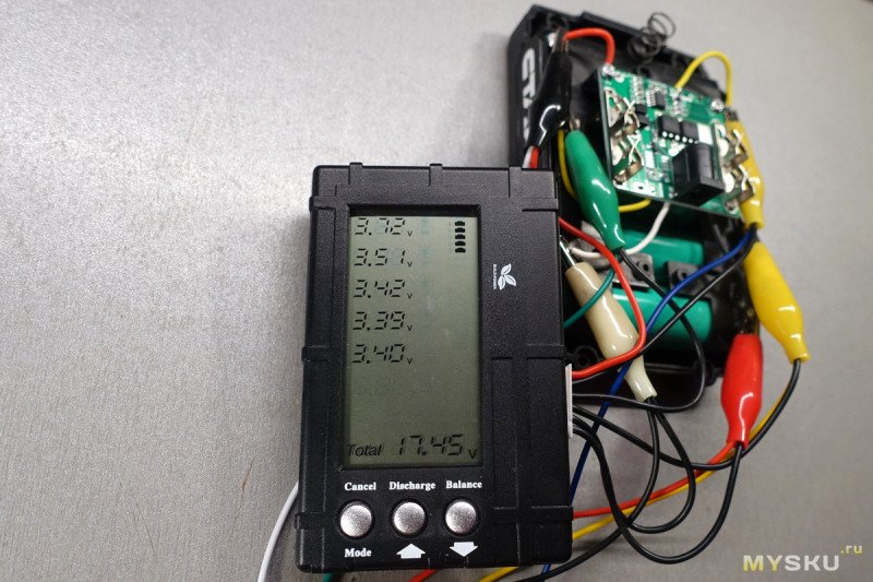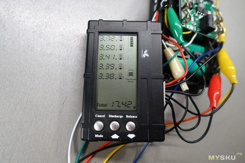 Кнопка Discharge запускает разряд всех ячеек до указанного напряжения. Это позволяет разрядить аккумулятор до полностью пожаробезопасного состояния, к тому же, литиевый аккумулятор, заряженный на 50-60% лучше переносит длительное хранение. Разряд каждой ячейки идёт тем же током 300 мА.