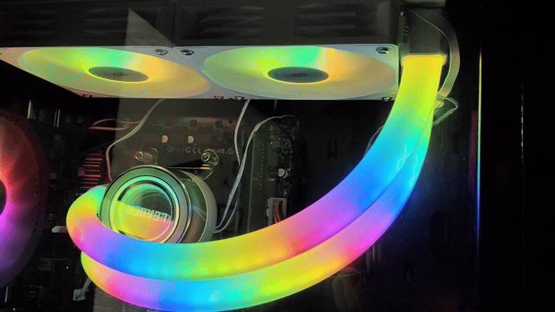 Подсветка светится, вентиляторы крутятся. В трубках видны светодиоды и что бы их стало не видно всё охлаждение нужно разворачивать (что бы трубки выходили со стороны озу), но у меня это сделать не получилось — мешает вентилятор на задней стенки да и сильный изгиб трубок, поэтому оставил как есть.