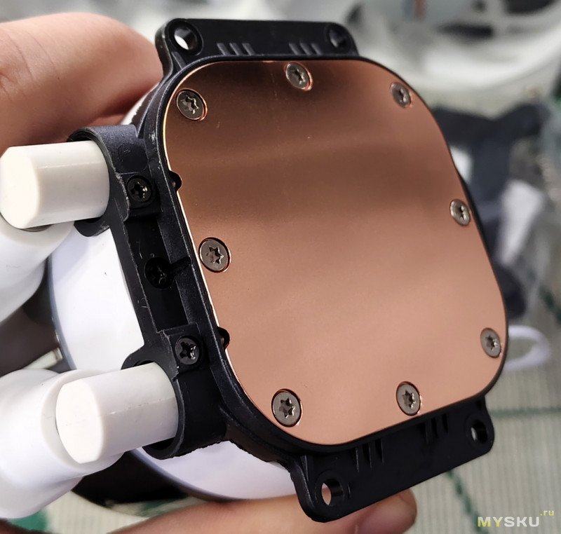 Подошва медная, на первый взгляд ровная и отполированная. Но если присмотреться — видна небольшая выпуклость по центру (где находятся микроканалы)