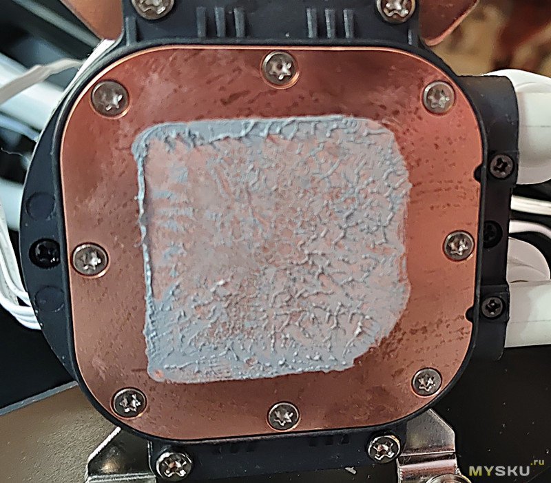 Позже при замене термопасты с gd900 на MX-2 посмотрел на отпечаток и увидел такую картину — с одной стороны край водоблока не прижимается к процессору.