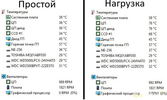 В целом выше 76 гр в стресс тесте не поднималась, а в играх она меньше. Пробовал крутить помпу на полную — разницы в температурах не увидел.