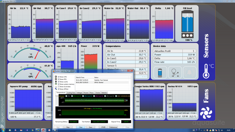 Гула вентиляторов на полных оборотах за мощным шумом проходящего через радиатор воздуха я не расслышал. Их я настроил на 1000об/м — и радиатор продувают и особо не шумят. В целом пк можно сказать не шумит — телефон намерил в среднем 35 dB, рокота и прочих раздражающих звуков нет.