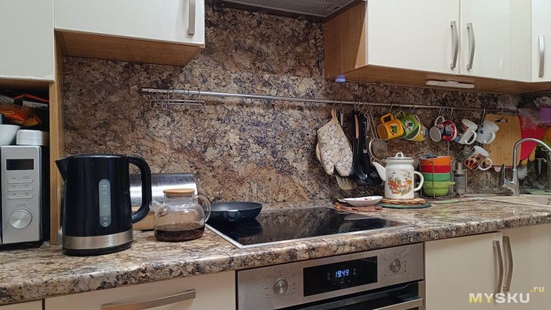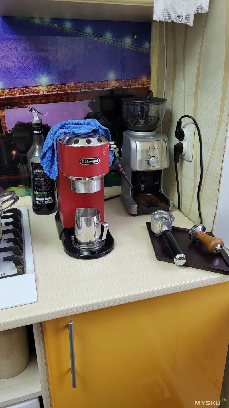 Планировал поставить её на подоконник в кухне, только там есть свободное место, всё остальное уже занято другой кухонной утварью. Однако ширина наших подоконников оказалась существенно меньше, чем глубина машины. Если только ставить её боком, но так не очень удобно будет пользоваться. Примерил её вместо хлебницы с чайником — встаёт хорошо, но находясь рядом с варочной поверхностью, корпус кофемашины очень быстро испачкается, а даже дальше находящийся от плиты чайник, весьма проблематично отмывается от жира.