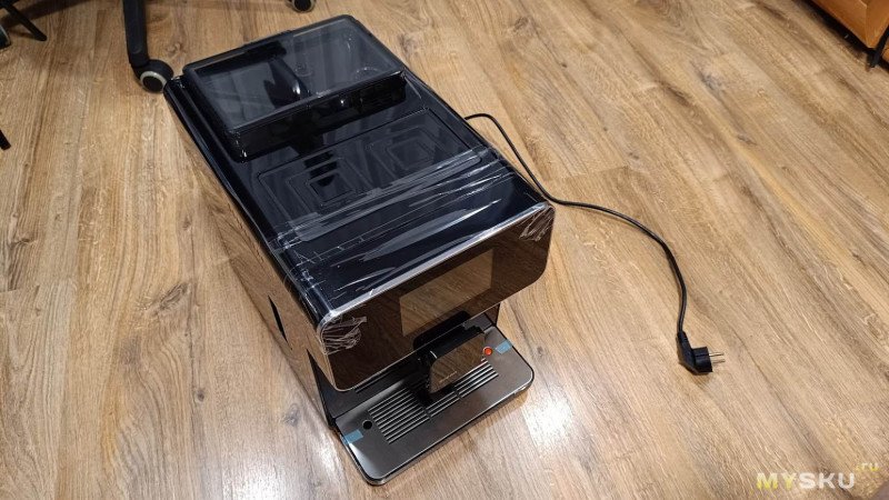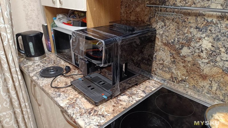 Несмотря на размеры коробки, я всё же надеялся, что кофемашина окажется менее габаритной, однако увы. Для нашей кухни это просто монстр. Даже и не знаю пока, куда её будем ставить.
