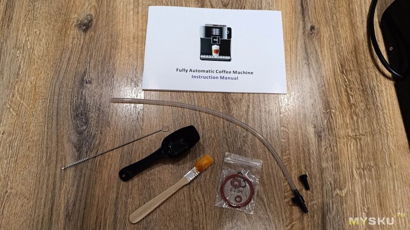В пакете, помимо инструкции, лежит мерная ложка для молотого кофе (машина умеет с ним работать), силиконовая трубочка для молока с запасным колпачком, металлический ёршик и кисточка с синтетическим ворсом для чистки внутренностей, а также набор запасных силиконовых уплотнительных колечек.