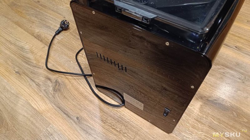 На задней стенке корпуса расположены вентиляционные отверстия, а внизу тумблер электропитания. Рядом с ним наклеена бирка с электрическими параметрами устройства: 220 — 240 В, 50/60 Гц, 1300 — 1500 Вт.