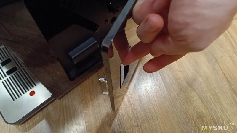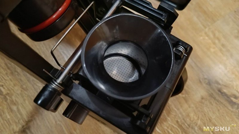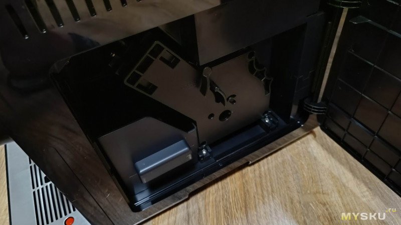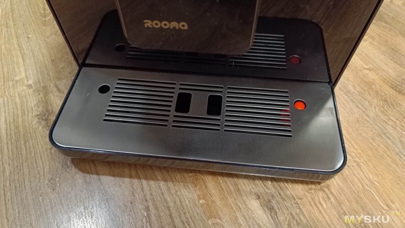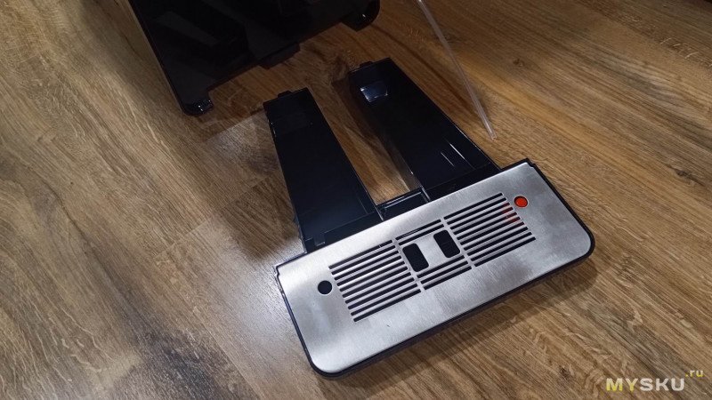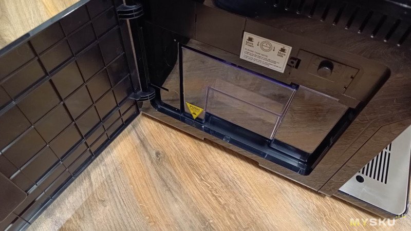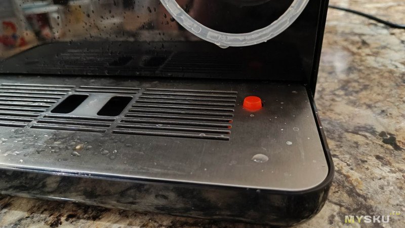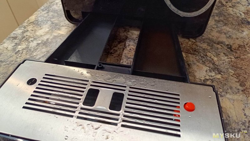 С передней стороны корпуса внизу установлен поддон со съёмной решёткой из нержавеющей стали. Сюда ставится чашка под кофе, а через отверстия сливается промывочная вода. Уровень заполнения показывает красный поплавок справа, как только он поднимется вверх, значит пришла пора опустошать поддон.