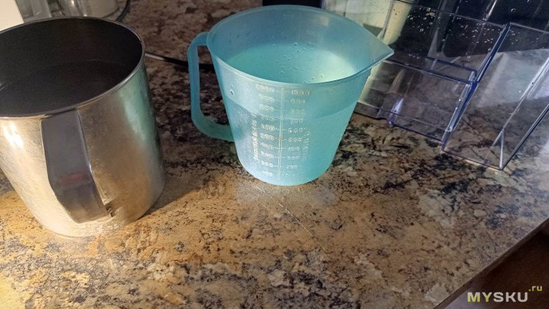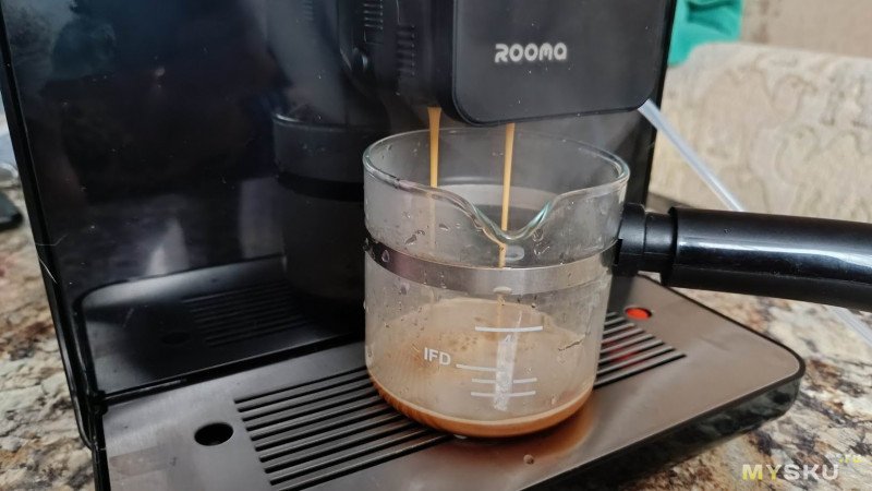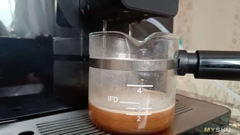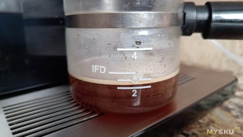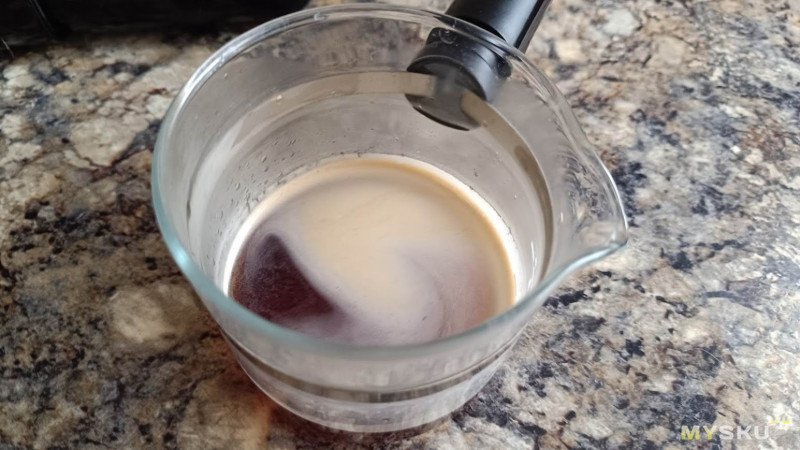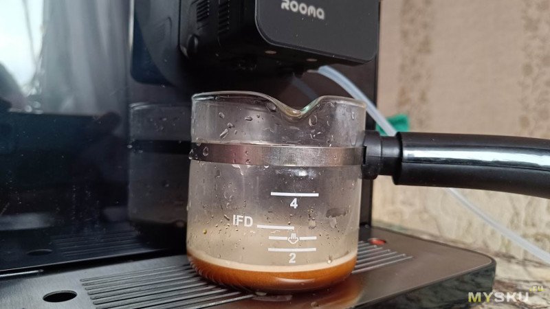 В итоге мы получаем вот такую порцию кофейного напитка американо. Я специально взял мерную кружку от рожковой кофеварки, чтобы был понятен объём, который заложен в программе по умолчанию (риски 2 и 4 соответствуют 200 и 400 мл).
