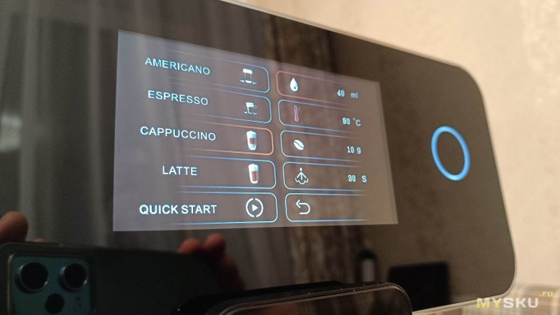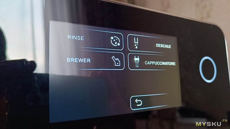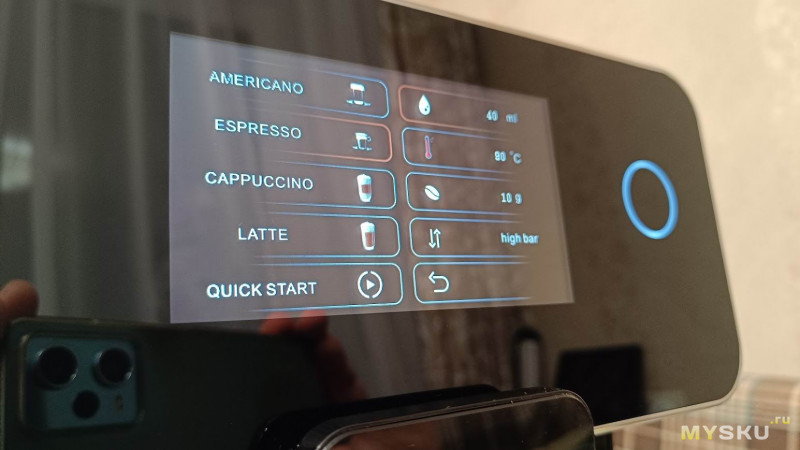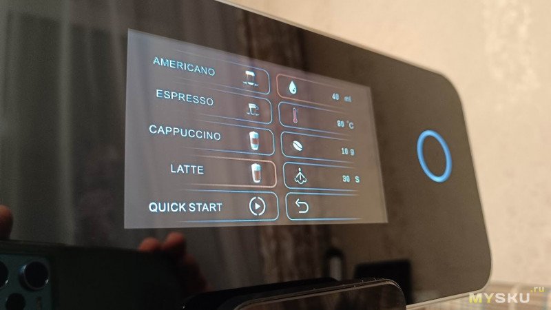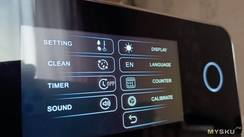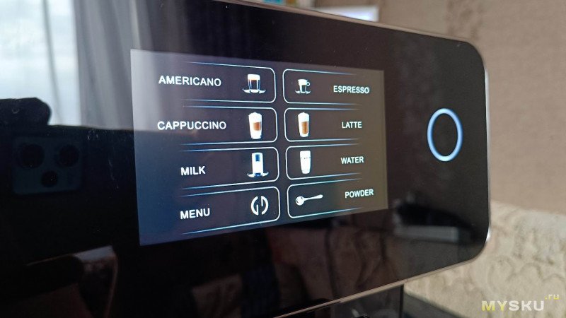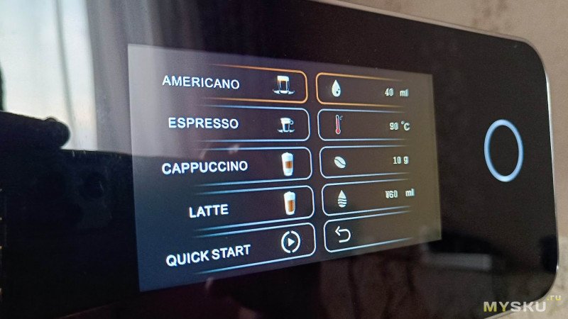 После окончания промывки на экране появляется основное меню. Кофемашина не предназначена для российского рынка и имеет только китайский или английский язык интерфейса. Благодаря наглядным анимированным иконкам, отсутствие перевода не станет преградой для приготовления кофе, даже для тех, кто совсем не знает английский язык. Так как это автоматическая кофемашина, то здесь по умолчанию стоит режим приготовления One Touch — в одно касание.