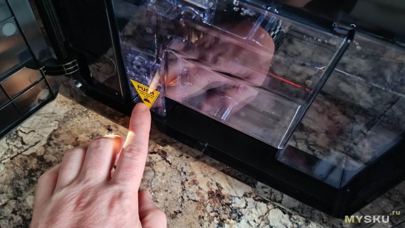 Заливаем воду и устанавливаем резервуар в свой отсек, причём внизу есть специальный предупреждающий жёлтый треугольник, на который нужно надавить, чтобы контейнер встал чётко на своё посадочное место.