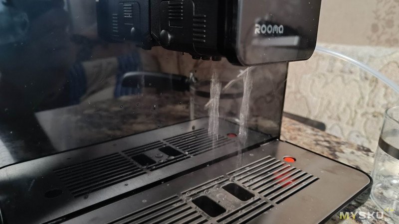 Далее машина наливает немного горячей воды в кружку, затем повисает пауза, по окончании которой кофе начинает лить в две струи, затем опять вода, но уже в большем количестве (видео будет в конце обзора).