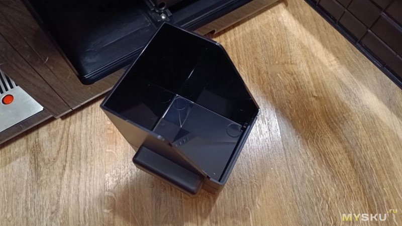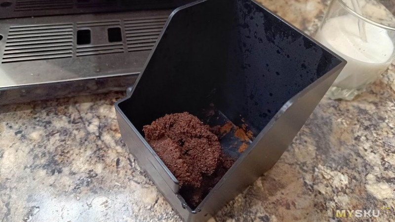 Контейнер для сбора кофейных отходов легко вынимается и моется под краном, тут никаких проблем и вопросов нет. К тому же машина сама предупреждает о необходимости его очистки.