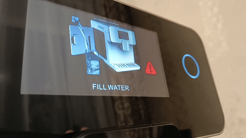 Если в резервуар не залита вода, машина сразу же об этом извещает анимацией на дисплее и звуковым сигналом.