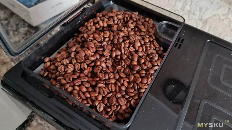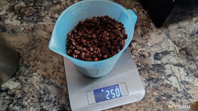 Бункер для кофейных зёрен по паспорту вмещает 250 грамм. Проверяем. Отмеряем на весах 250 г. и засыпаем в бункер.
