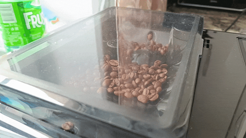 После нажатия кнопки с выбранным в меню напитком, раздаётся жужжащий звук. Кофемашина начинает забор зерна из бункера, а затем помол выбранного количества зёрен. Я вначале оставлю все значения, которые установлены в настройках по умолчанию, а значит на кружку американо будет истрачено 10 грамм кофе.