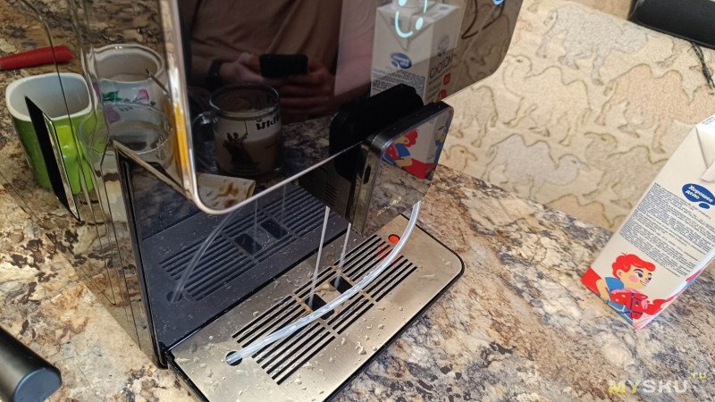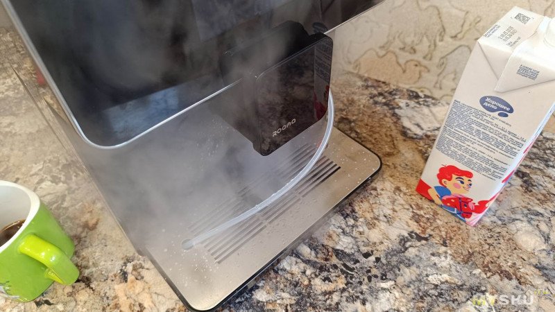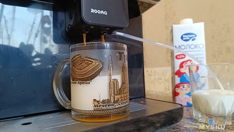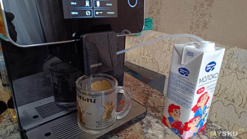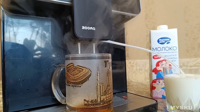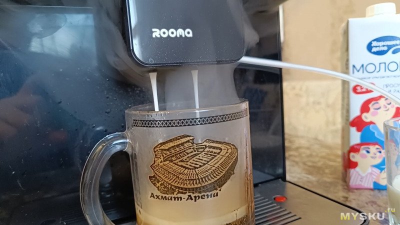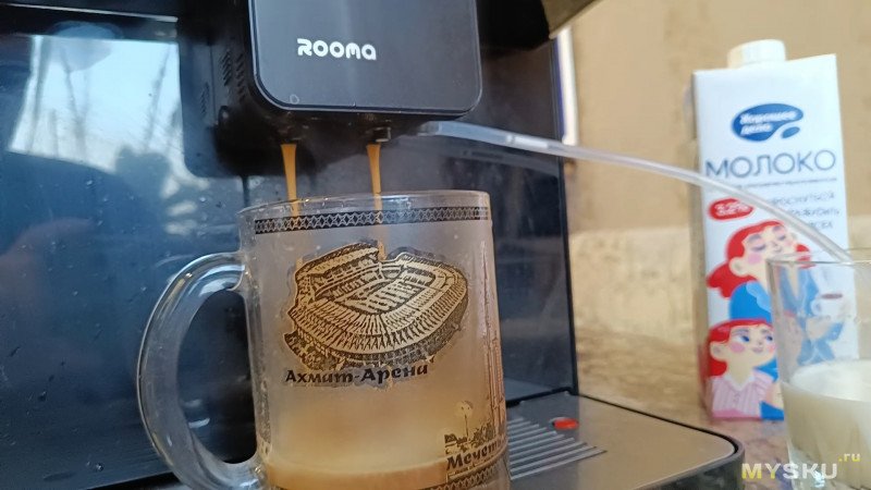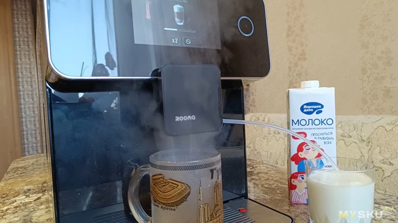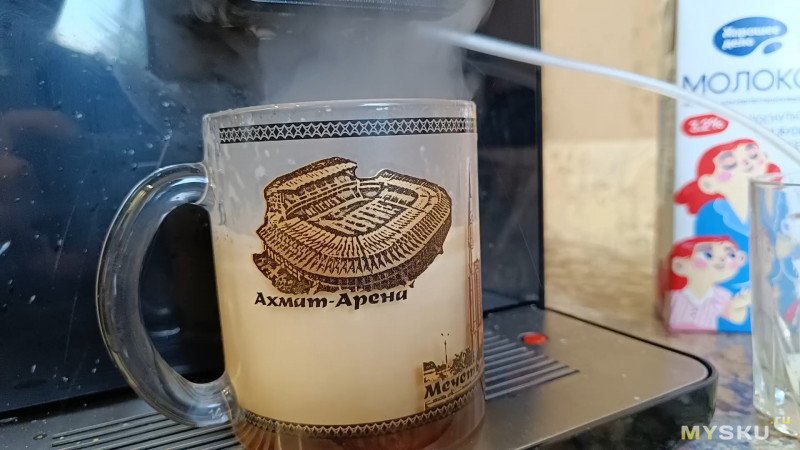Вновь машина мелет кофе, потом на экране появляется изображение напитка со шкалой термометра — происходит нагрев. Затем кружка обдаётся паром, после чего идёт молоко. В настройках по умолчанию оно почти жидкое, пены мало. В самом конце добавляется кофе.