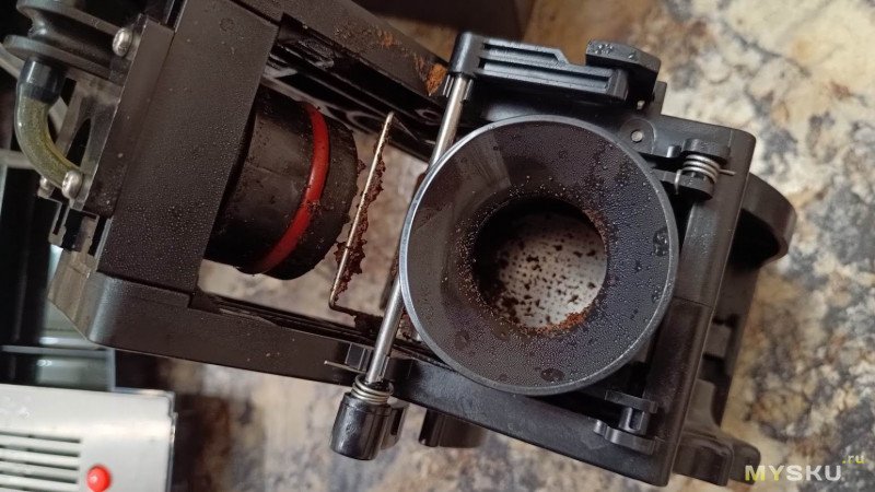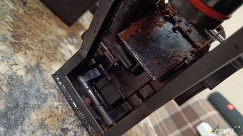А вот так пачкается сам заварочный блок. Мыть его под струёй воды опасаюсь, смахиваю комплектной кисточкой и очищаю влажной тканью.